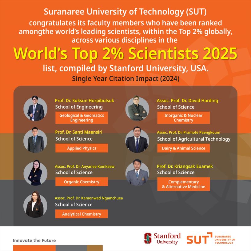 Suranaree University of Technology (SUT) congratulates its faculty members who have been ranked among the world’s leading scientists, within the Top 2% globally, across various disciplines in the “World’s Top 2% Scientists 2025” list, compiled by Stanford University, USA.