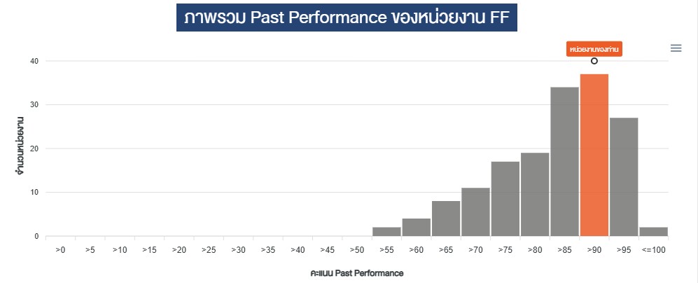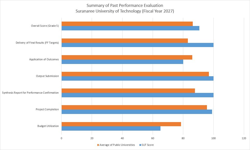 According to TSRI’s national Past Performance data, only a limited number of institutions scored above 90 points. This reflects that SUT is among the top-performing public universities in Thailand with exceptional research management capacity. The Past Performance (PP) evaluation criteria, developed by TRIS Corporation under TSRI’s framework, assess budget utilization efficiency, project implementation, research result delivery, research application, and qualitative research outcomes. A Grade 5 (score above 85 points) signifies the highest level of achievement, indicating excellence in institutional performance.