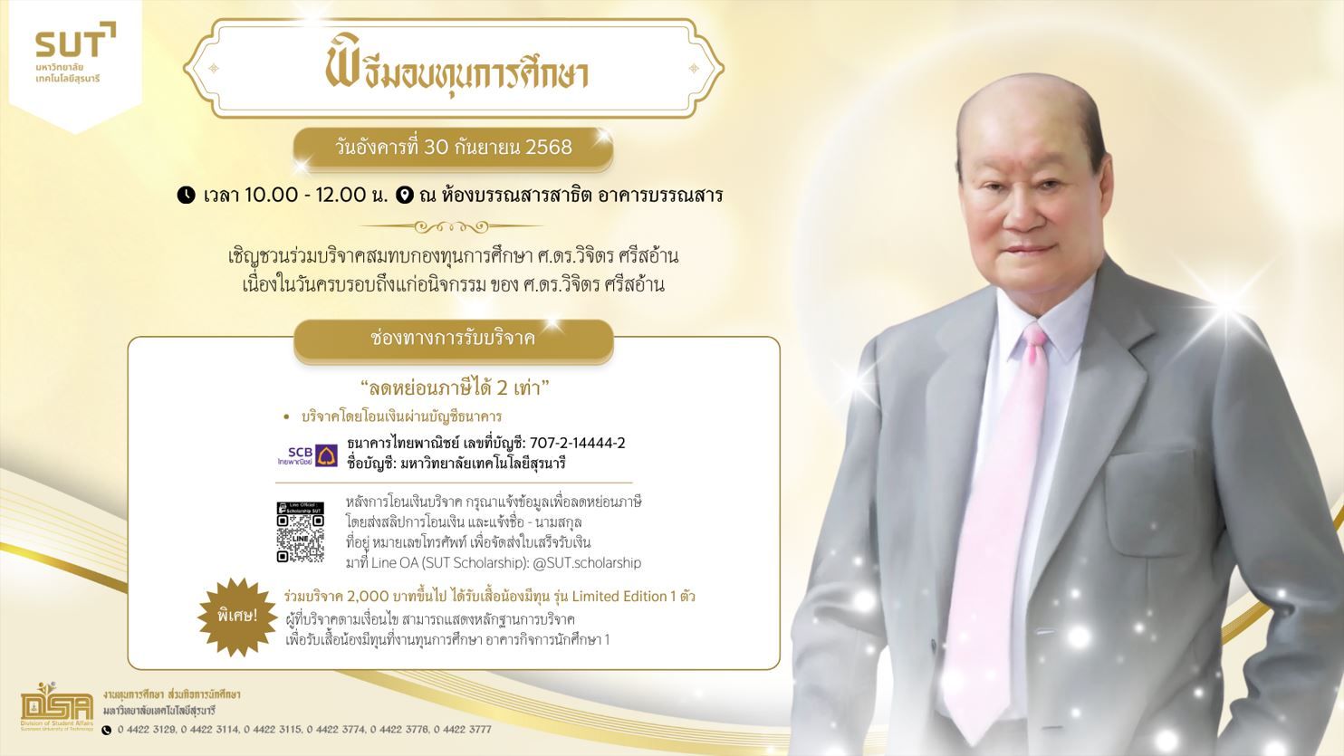 อ.ดร.สิรินทร ศรีโพธิ์ รักษาการแทนรองอธิการบดีฝ่ายกิจการนักศึกษาและศิษย์เก่าสัมพันธ์ มทส. เป็นประธาน “พิธีมอบทุนการศึกษาจากกองทุนการศึกษาแก่นักศึกษา กองทุนการศึกษา ศาสตราจารย์ ดร.วิจิตร ศรีสอ้าน” โดยเป็นการจัดสรรทุนการศึกษา ทุนช่วยค่าครองชีพรายเดือน สำหรับนักศึกษาที่ขาดแคลนทุนทรัพย์ รวมจำนวน 60 ทุนๆ ละ 36,000 บาท รวมเป็นเงิน 2,160,000 บาท พร้อมการกล่าวสดุดีเกียรติคุณและระลึกถึง ศาสตราจารย์ ดร. วิจิตร ศรีสอ้าน อธิการบดีผู้ก่อตั้ง มทส. ในโอกาสครบรอบ 2 ปี การถึงแก่นิจกรรม โดยจัดนิทรรศการกองทุนการศึกษา ทุนการศึกษา มทส.และกิจกรรมเยี่ยมชมหอประวัติ “วิจิตรกิตติการ” ณ หอประวัติมหาวิทยาลัยเทคโนโลยีสุรนารี ชั้น 2 อาคารบรรณสาร มทส.