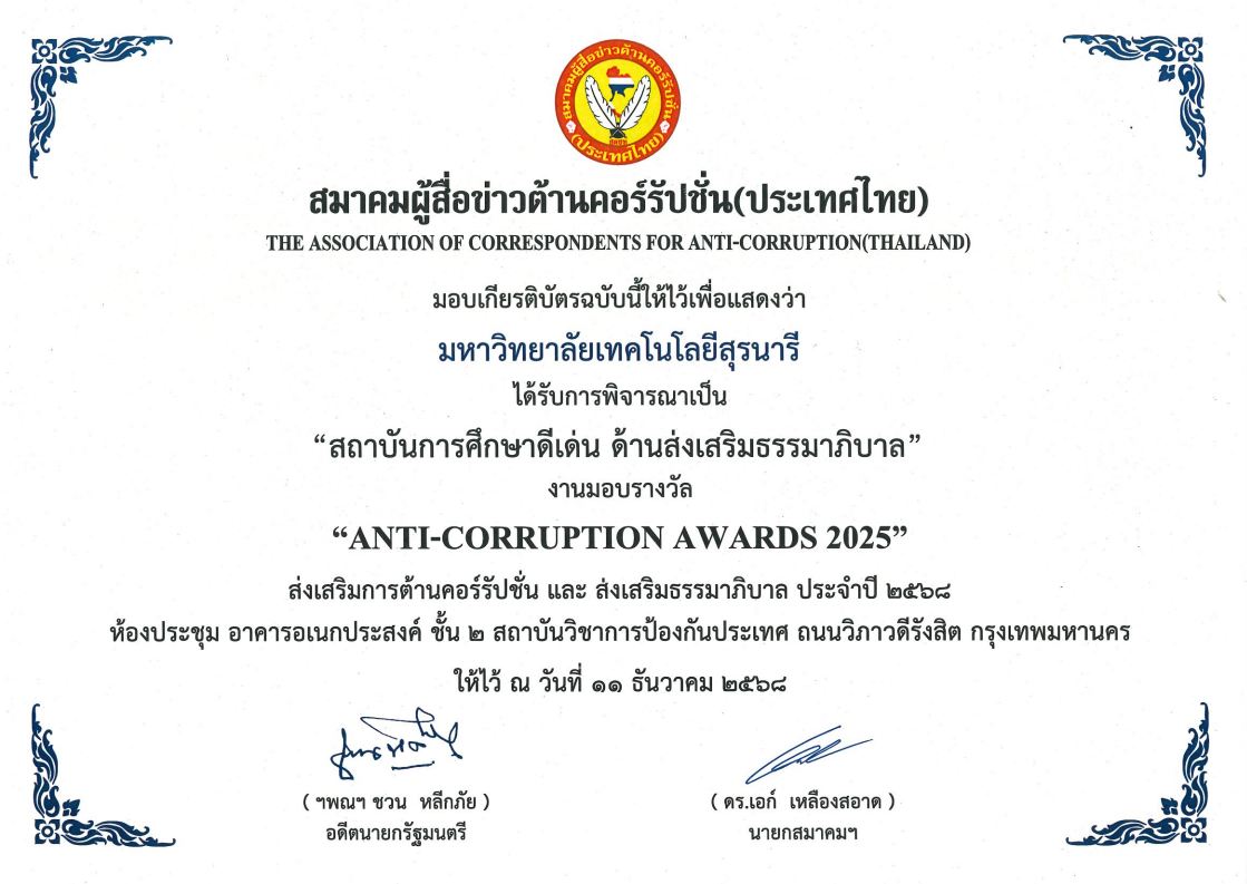 มหาวิทยาลัยเทคโนโลยีสุรนารี (มทส.) รับรางวัล “ANTI-CORRUPTION AWARDS 2025” ในฐานะสถาบันการศึกษาดีเด่น ด้านการส่งเสริมธรรมาภิบาล ประจำปี 2568 จาก สมาคมผู้สื่อข่าวต้านคอร์รัปชัน (ประเทศไทย) เพื่อเชิดชูองค์กรที่ยึดหลักธรรมาภิบาลและปฏิบัติหน้าที่ด้วยความโปร่งใส ซื่อสัตย์สุจริต โดยให้ความสำคัญกับการต่อต้านทุจริตคอร์รัปชัน