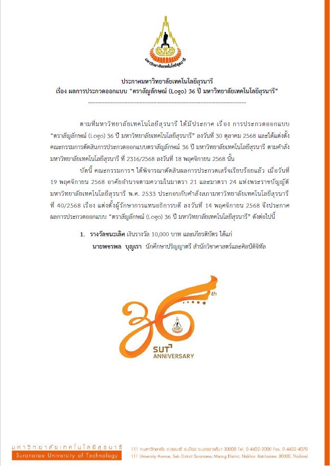 ประกาศผลการประกวดออกแบบตราสัญลักษณ์ (Logo) 36 ปี มหาวิทยาลัยเทคโนโลยีสุรนารี