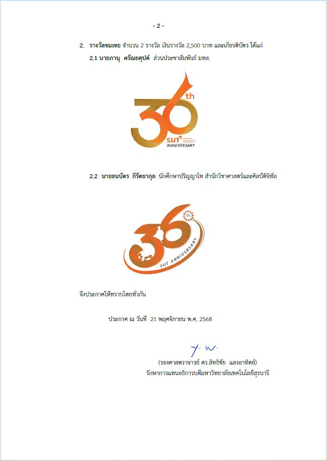 มหาวิทยาลัยเทคโนโลยีสุรนารี ขอแสดงความยินดีกับผู้ได้รับรางวัลทุกท่าน และขอขอบคุณผู้เข้าร่วมส่งผลงานทุกคนที่ร่วมแสดงพลังความคิดสร้างสรรค์ในโอกาสครบ 36 ปี แห่งการสถาปนามหาวิทยาลัย
